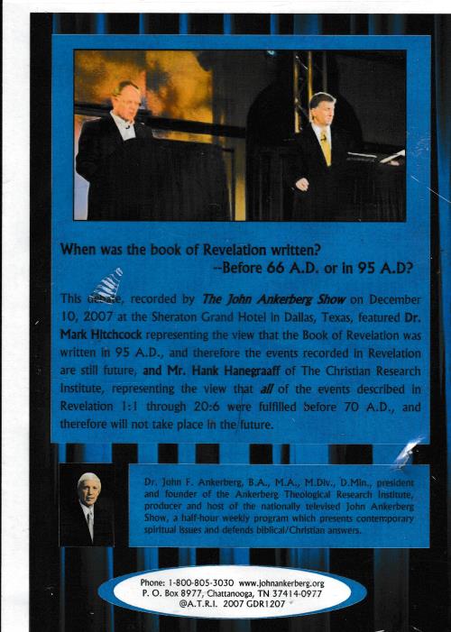 This debate, recorded by The John Ankerberg Show on December 10, 2007 at the Sheraton Grand Hotel in Dallas, Texas, featured Dr. Mark Hitchcock representing the view that the Book of Revelation was written in 95 A.D., and therefore the events recorded in Revelation are still future, and Mr. Hank Hanegraaff of The Christian Research Institute, representing the view that all of the events described in Revelation 1:1 through 20:6 were fulfilled before 70 A.D., and therefore will not take place in the future.