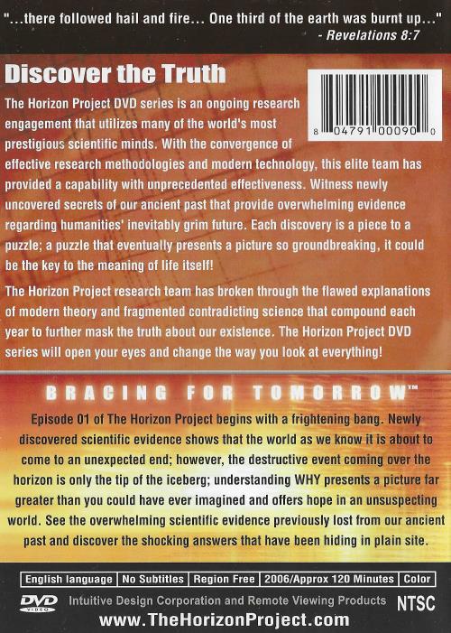 HORIZON Discover the Truth 11 00 The Horizon Project DVD series is an ongoing research engagement that utilizes many of the world's most prestigious scientific minds. With the convergence of effective research methodologies and modern technology, this elite team has provided a capability with unprecedented effectiveness. Witness newly uncovered secrets of our ancient past that provide overwhelming evidence regarding humanities' inevitably grim future. Each discovery is a piece to a puzzle; a puzzle that eventually presents a picture so groundbreaking, it could be the key to the meaning of life itself! The Horizon Project research team has broken through the flawed explanations of modern theory and fragmented contradicting science that compound each year to further mask the truth about our existence. The Horizon Project DVD series will open your eyes and change the way you look at everything! BRACING FOR TOMORROW