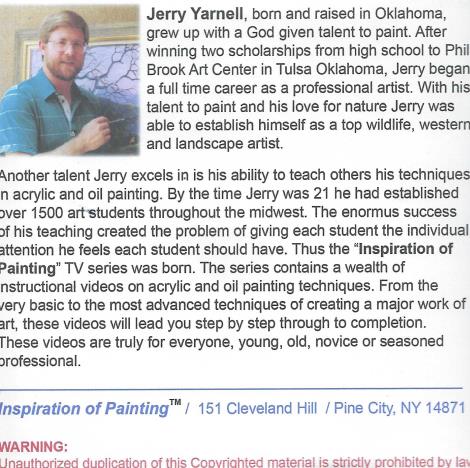 By the time Jerry was 21 he had established Dyer 1500 art students throughout the midwest. The enormus success Df his teaching created the problem of giving each student the individual attention he feels each student should have. Thus the "Inspiration of Painting" TV series was born. The series contains a wealth of nstructional videos on acrylic and oil painting techniques. From the very basic to the most advanced techniques of creating a major work of art, these videos will lead you step by step through to completion. These videos are truly for everyone, young, old, novice or seasoned Professional.
