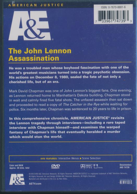 A comprehensive chronicle from A&E's American Justice that examines the tragic murder of John Lennon and the man responsible. The program traces Mark David Chapman's obsession and the events of December 8, 1980, when Chapman fired five fatal shots outside the Dakota building as Lennon returned home. Six months later, Chapman was sentenced to 20 years to life in prison.