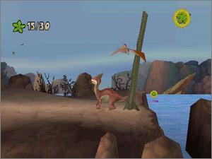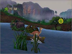 Featuring characters from the animated film series, The Land Before Time: Big Water Adventure lets young players guide Littlefoot, Ducky, Cera, and Spike through 14 levels in four worlds: Mountain Pass, Great Landbreak, New Water, and Soggy Swamp. Characters jump, run, slide, head-butt, and tail-whip as they explore levels containing obstacles such as moving logs, trees, lava, geysers, rivers, and ravines. The objective in each level is to collect 30 "treestars" and unlock bonus picture puzzles in Petrie's Palace.
