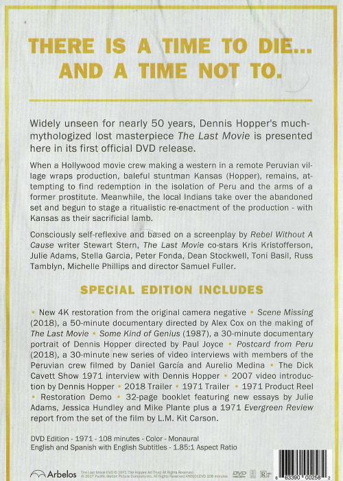 Widely unseen for nearly 50 years, Dennis Hopper's much-mythologized lost masterpiece The Last Movie is presented here in its first official DVD release. When a Hollywood movie crew making a western in a remote Peruvian vil-lage wraps production, baleful stuntman Kansas (Hopper), remains, at-tempting to find redemption in the isolation of Peru and the arms of a former prostitute. Meanwhile, the local Indians take over the abandoned set and begun to stage a ritualistic re-enactment of the production - with Kansas as their sacrificial Iamb. Consciously self-reflexive and based on a screenplay by Rebel Without A Cause writer Stewart Stern, The Last Movie co-stars Kris Kristofferson, Julie Adams, Stella Garcia, Peter Fonda, Dean Stockwell, Toni Basil, Russ Tamblyn, Michelle Phillips and director Samuel Fuller. DVD Edition - 1971 - 108 minutes - Color - Monaural English and Spanish with English Subtitles - 1.85:1 Aspect Ratio 14