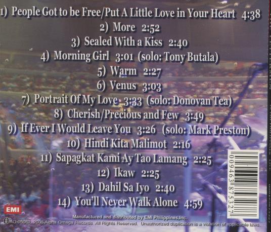 2007 release from the vocal trio, recorded during a recent trek to the Philippines, where they remain as popular as ever. Still featuring founding member and lead vocalist Tony Butala, The Lettermen have survived for nearly 50 years. Live in the Philippines includes such favorites as "Venus," "Warm,", "Cherish/Precious and Few," "Sealed with a Kiss" and "You'll Never Walk Alone." plus Tagalog songs such as "Dahil Sal Yo," "Hindi Kita Malimot," and "Sapakat Kami Ay Tao Lamang" are also included on this CD. EMI. Recorded at Araneta Coliseum, Manila, January 2006.