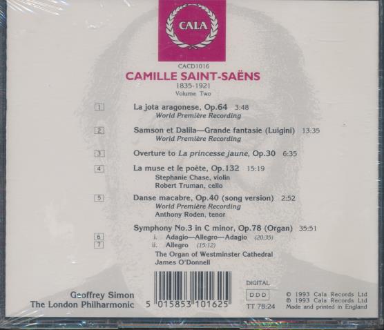 Camille Saint-Saëns (1835–1921) is one of the major French Romantic composers, celebrated for his melodic invention and orchestral colour. This Volume Two collection presents orchestral and vocal works performed by The London Philharmonic under Geoffrey Simon. The program features world premiere recordings and highlights such as Danse macabre (song version), La jota aragonese and the Symphony No.3 with organ. Soloists include Stephanie Chase (violin), Robert Truman (cello), Anthony Roden (tenor) and James O'Donnell on the organ.