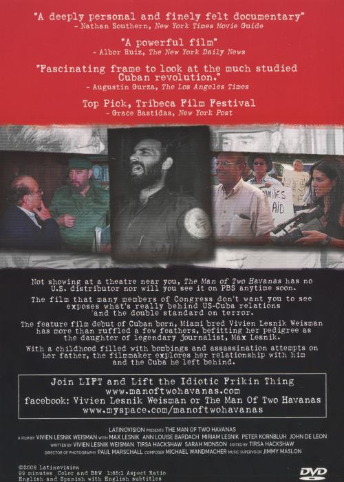 Not showing at a theatre near you, The Man of Two Havanas has no U.S. distributor nor will you see it on PBS anytime soon. The film that many members of Congress don't want you to see exposes what's really behind US-Cuba relations and the double standard on terror. The feature film debut of Cuban born, Miami bred Vivien Lesnik Weisman has more than ruffled a few feathers, befitting her pedigree as the daughter of legendary journalist, Max Lesnik. With a childhood filled with bombings and assassination attempts on her father, the filmmaker explores her relationship with him and the Cuba he left behind.