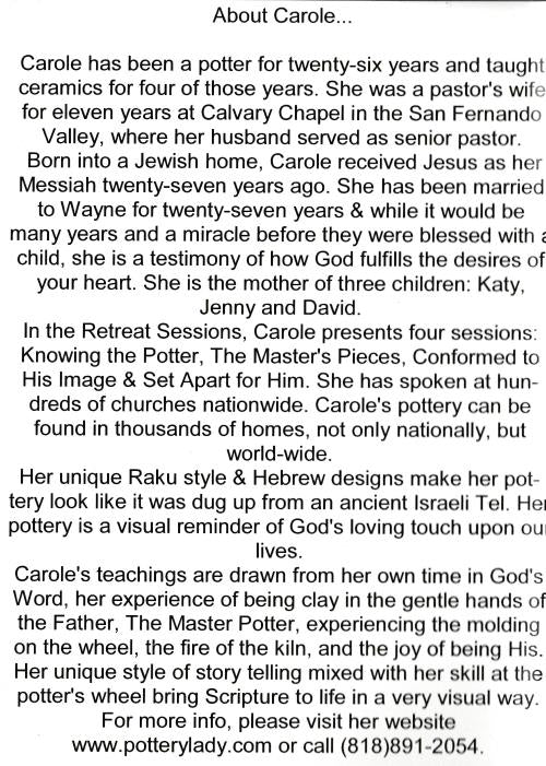 Master's Pieces Retreat Set ~ This is a recording of a weekend presentation, a deeper study into the Master's Pieces.*There are four lessons from the Potter's wheel including: Knowing the Potter, The Master's Pieces, Conformed to His Image, and Set Apart For Him.