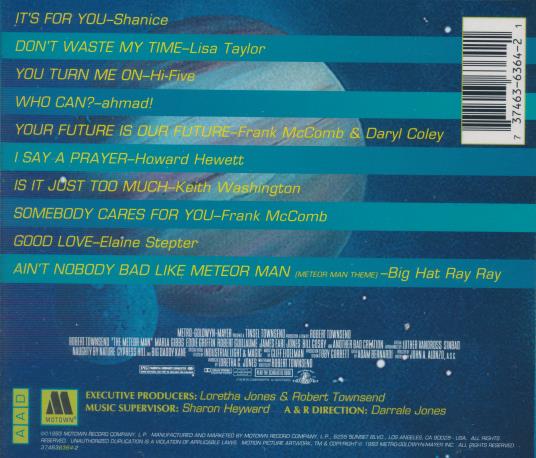 The Meteor Man soundtrack accompanies the MGM motion picture directed by and starring Robert Townsend. The album collects contemporary R&B and soul performances by artists featured on the film soundtrack. Contributors include Shanice, Hi-Five, Ahmad!, Frank McComb, Howard Hewett, Keith Washington and others. The collection blends smooth R&B ballads and up tempo contemporary soul suitable for fans of early 1990s urban soundtrack releases.