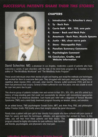 Dr. Schechter is the author of The MindBody Workbook" and "The MindBody Audio Program". These seven individuals share their stories of pain and healing and reveal the methods and techniques that worked for them to overcome their pain. They struggled with back pain, neck pain, bulging discs, repetitive strain injuries (RSI), arm pain, ulnar neuritis, thoracic outlet syndrome (TOS) and two of them had previously had surgery. Several of them suffered for over five years; one was unable to work for over two years due to pain. This diverse group of patients includes men and women in their 20's, 30's, 40's, and 50's united by a history of long-standing pain that could not successfully be relieved with conventional approaches whose focus is on structural disorders.