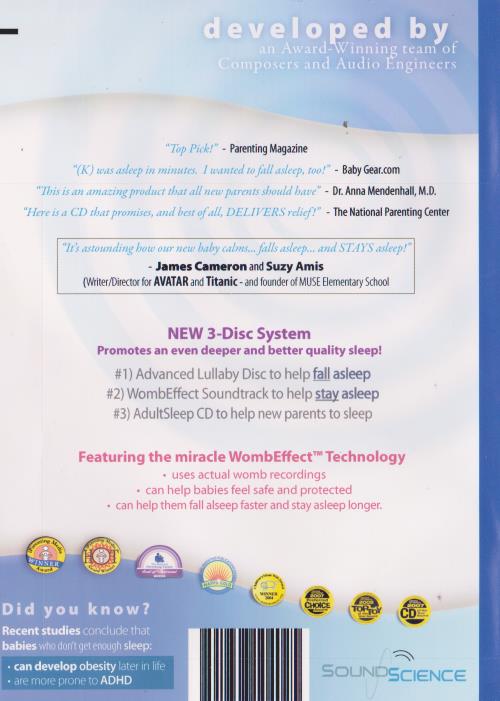 3-Disc System Promotes an even deeper and better quality sleep! #1) Advanced Lullaby Disc to help fall asleep #2) WombEffect Soundtrack to help stay asleep #3) AdultSleep CD to help new parents to sleep Featuring the miracle WombEffectm" Technology • uses actual womb recordings • can help babies feel safe and protected • can help them fall alseep faster and stay asleep longer. Did you know? Recent studies conclude that babies who don't get enough sleep: • can develop obesity later in lite • are more prone to ADHD