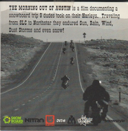 THE MORNING OUT OR AUSTIN is a film documenting a snowboard trip 9 dudes took on their Harleys. Traveling from SLC to Northstar they endured Sun, Rain, Wind, Dust Storms and even snow!