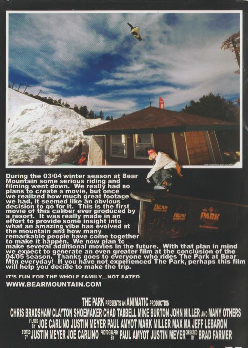 During the 03/04 winter season at Bear Mountain some serious riding and filming went down. We really had no plans to create a movie, but once we realized how much great footage we had, it seemed like an obvious decision to go for it. This is the first movie of this caliber ever produced by rr a resort. It was really made in an effort to provide some insight into what an amazing vibe has evolved at the mountain and how many remarkable people have come together to make it happen. We now plan to make several additional movies in the future.