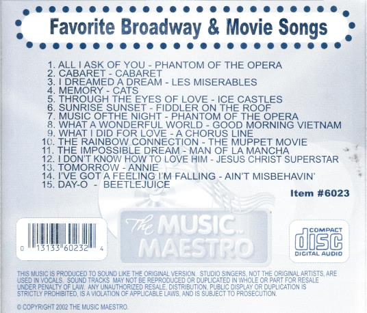 1.ALL I ASK YOU – PHANTON OF THE OPERA2.CABARET – CABERET3.I DREAMED A DREAM – LES MISERABLES4.MEMORY – CATS5.THROUGH THE EYES OF LOVE – ICE CASTLES6.SUNRISE SUNSET – FIDDLER ON THE ROOF7.MUSIC OF THE NIGHT – PHANTON OF THE OPERA8.WHAT A WONDERFUL WORLD – GOOD MORNING VIETNAM9.WHAT I DID FOR LOVE – A CHORUS LINE10.THE RAINBOW CONNECTION – THE MUPPET MOVIE11.THE IMPOSSIBLE DREAM – MAN OF LA MANCHA12.I DON’T KNOW HOW TO LOVE HIM – JESUS CHRIST SUPERSTAR13.TOMORROW – ANNIE14.I’VE GOT A FEELING I’M FALLING – AIN’T MISBEHAVIN’15.DAY-O – BEETLEJUICE