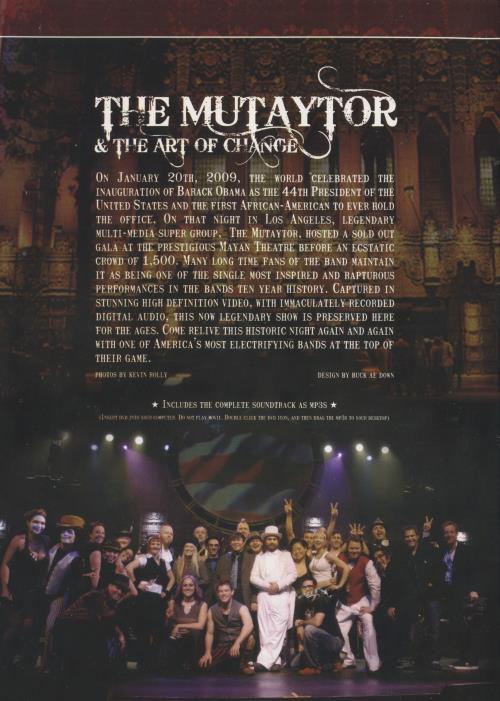 On January 20th, 2009, the world celebrated the inauguration of Barack Obama as the 44th President of the United States and the first African-American to ever hold the office. On that night in Los Angeles, legendary multi-media super group, The Mutaytor, hosted a sold out gala at the prestigious Mayan Theatre before an ecstatic crowd of 1,500. Many longtime fans of the band maintain it as being one of the single most inspired and rapturous performances in the band's ten-year history. Captured in stunning high definition video, with immaculately recorded digital audio, this now legendary show is preserved here for the ages. Relive this historic night again and again with one of America's most electrifying bands at the top of their game.