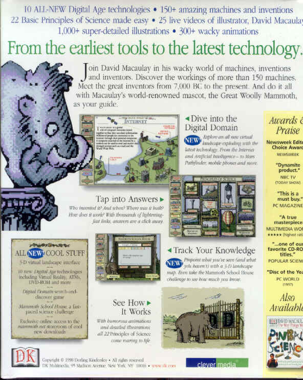 Based on the book The Way Things Work, this CD-Rom game teaches players about a number of different scientific concept as well as showing how many ordinary objects that we use everyday function. Players can either explore the machines shown in the program, or attend "Mammoth School", where players must answer five questions on each of a variety of concepts to master each concept. Narration is provided both by animated quicktime movies that show how various parts work, and by showing David Macaulay himself as he explains the principles that make some of the objects work.