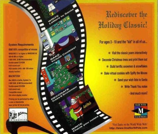 And of course, there are two fully interactive animated versions of the famous Night Before Christmas poem -- filled with hundreds of frames of surprise animations: One version teaches you the definitions of the difficult words as you read along with the narrator; The other is an interactive investigative fantasy which guides you through the poem at your own pace.