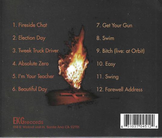 SKRATCH MAGAZINE: #72, 2002 This 12-song release from the Orange County-based trio is a sizzling jazz/punk exercise that will keep even the most jaded fan on edge. Their music is a startling combination of quick moshes, uptempo breaks, and unexpected tempos. On tunes such as 'Beautiful Day' the soft melodic guitar riff lures the listener in for about 30 seconds before pounding them over the head with hard-rocking funk. There is plenty of political material on this album, as well as some hardcore punk, and even a surf song. The Nixon Years is easily one of the most creative bands on the Southern Californian scene today. Catch their music now before a major label gets a hold of them and tells them they can't do anything they want. Sometimes naiveté is bliss.