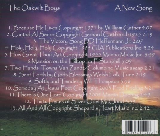 The Oakwilt Boys are a male vocal group who perform traditional Christian hymns and country gospel material. Their sound features close harmonies, acoustic guitar, banjo and a homespun rural approach. The group presents reverent arrangements of classic hymns alongside original gospel songs. This release captures their warm, community oriented style and simple, heartfelt delivery.
