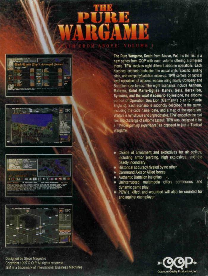 The Pure Wargame, Death from Above, Vol. I is the first in a new series from OOP with each volume offering a different theme. TPW involves eight different airborne operations. Each historical scenario embodies the actual units, specific landing sites, and company/battalion make-up. TPW centers on tactical level operations of airborne warfare using mainly Company and Battalion size forces. The eight scenarios include Arnhem, Maleme, Saint Marie-Eglise, Kanev, Gela, Heraklion, Syracuse, and the what if scenario Folkestone, the airborne portion of Operation Sea Lion (Germany's plan to invade England). Each scenario is succinctly described in the game, including the code name, date, and a map of the operation. Warfare is tumultuous and unpredictable. TPW embodies the real feei and challenge of airborne assault. TPW was designed to be a "Whole gaming experience" as opposed to just a Tactical Wargame.