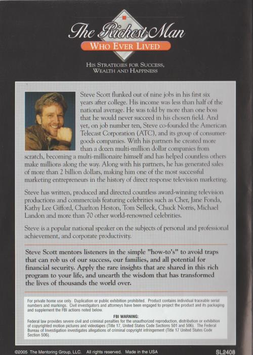 HIS STRATEGIES FOR SUCCESS, WEALTH AND HAPPINESS Steve Scott flunked out of nine jobs in his first six years after college. His income was less than half of the national average. He was told by more than one boss that he would never succeed in his chosen field, Any I yet, on job number ten, Steve co-founded the A111(.1 it :a I Telecast Corporation (ATC), and its grow )1«,n,umil goods companies. With his partners he created nit n than a dozen multi-million dollar companies front scratch, becoming a multi-millionaire himself and has helped count It .1,, make millions along the way. Along with his partners, he has general e,I sales of more than 2 billion dollars, making him one of the most successful marketing entrepreneurs in the history of direct response television market Steve has written, produced and directed countless award-winning television productions and commercials featuring celebrities such as Cher, Jane Fonda, Kathy Lee Gifford, Charlton Heston, Tom Selleck, Chuck Norris, Michael Landon and more than 70 other world-renowned celebrities. Steve is a popular national speaker on the subjects of personal and professional achievement, and corporate productivity. Steve Scott mentors listeners in the simple "how-to's" to avoid traps that can rob us of our success, our families, and all potential for financial security. Apply the rare insights that are shared in this rich program to your life, and unearth the wisdom that has transformed the lives of thousands the world over.
