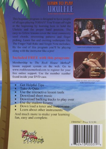 "60 minute DVD in Amaray Case Learn to Play Ukulele, An Easy Step-by-Step Guide for Beginners from Rock House is a DVD designed to have people of all ages playing today. You'll start off right at the beginning by learning how to hold the ukulele and proper hand position. The easy-to-follow lessons cover the most commonly used chords, strumming patterns and fingerpicking. Learn fun and exciting techniques like the ""fingernail rake"" and ""single note melodies."" By the end of this program you'll be playing your ukulele along with the instructor like a pro. The DVD includes close-up views and multi-angle shots to make learning easy. Each Rock House product includes free lifetime membership to Rock House's online lesson support system. Enhance your learning experience, links with instructors, download backing tracks, access message boards, and much more. You'll connect with a community of musicians around the world learning to play music using The Rock House Method."