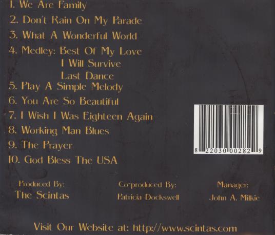 Live Scintas show performance CD...10 tracks; 1. We are Family, 2. Don't Rain on My Parade, 3. What A Wonderful World, 4. Medley : Best of My Love - I Will Survive - Last Dance, 5. Play a Simple Melody, 6. You are So Beautiful, 7. I Wish I Was Eighteen Again, 8. Working Man Blues, 9. The Prayer, 10. God Bless The USA....