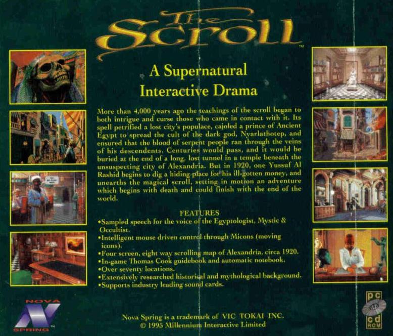 The Scroll is set in the year 1920. As a drug lord is digging a hiding place for ill gotten booty, he unearths a scroll that is rumored to curse whoever comes in contact with it. The subsequent black market appearance of this scroll sets off an evil chain of events that could finish with the end of the world. You can play either as Matthew Faulkner, an Egyptologist, or as an occultist, George Stanhope, as you attempt to discover the whereabouts of the scroll (at least that is what I think you are trying to do).