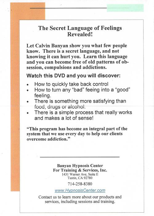 The Secret Language of Feelings Revealed! Let Calvin Banyan show you what few people know. There is a secret language, and not knowing it can hurt you. Learn this language and you can become free of old patterns of ob-session, compulsions and addictions. Watch this DVD and you will discover: • How to quickly take back control • How to turn any "bad" feeing into a "good" feeling. • There is something more satisfying than food, drugs or alcohol. • There is a simple process that really works and makes a lot of sense!