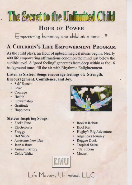As the child plays, an Hour of upbeat, magical music begins. Nearly 400 life empowering affirmations condition the mind just below the audible level. A "good feeling" generates from deep within as the 16 background tunes fill the air with Rhythmic Enlightenment. Listen as Sixteen Songs encourage feelings of: Strength, Encouragement, Confidence, and Joy. • Self-Esteem • Love • Courage • Health • Stewardship • Gratitude • Happiness Sixteen Inspiring Songs: • Feel'n Fine • Electrofects • Froggy • Hot Sauce • Awesome New Day • Animal Factory • Celtic Waltz • Rock'n Robots • Kool Kat • Hughy's Big Adventure • Angelica's Journey • Reggae Duck • Tropical Salsa • 70's Sitcom • Mozart