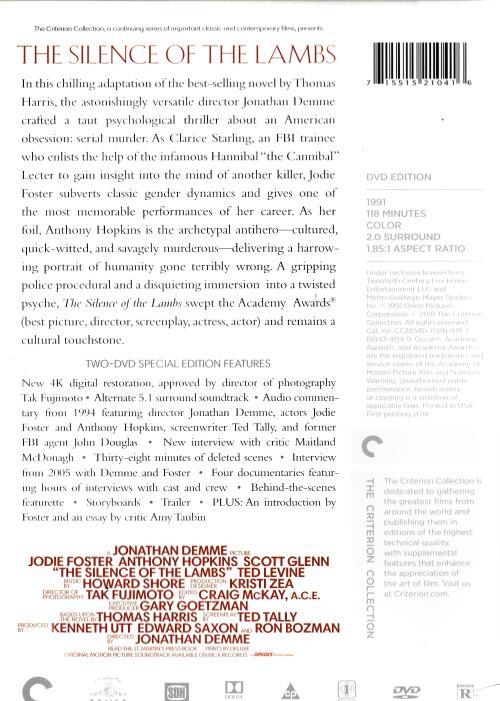 - PLUS: A book featuring an introduction by Foster, an essay by critic Amy Taubin, pieces from 2000 and 2013 by author Thomas Harris on the origins of the character Hannibal Lecter, and a 1991 interview with Demme