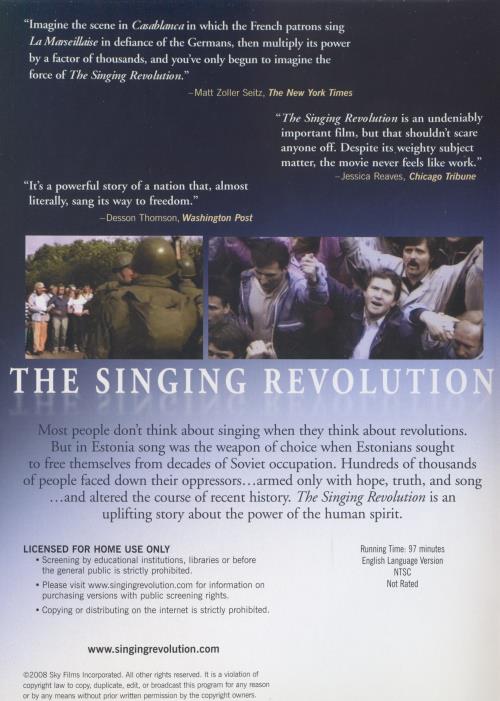 When the Soviet nation finally began to crumble in the 1980s, the Estonians saw their opportunity: free speech became song, and song became a soaring anthem of independence. Dramatically capturing the spectacular beauty of Estonia and the overwhelming sea of people and sound that brought this nation together, THE SINGING REVOLUTION celebrates a people who revolted with no weapons but their songs, no force but their unstoppable dream.