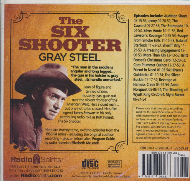 Lean of figure and tanned skin, his steely eyes gaze out over the violent frontier of the American West. He's a quiet man, but one not to be crossed. He's film legend James Stewart in his only continuing radio role as Britt Ponset, the Six Shooter. Here are twenty tense, exciting episodes from the 1953-54 series – including the original audition recording – plus an informative program guide by radio historian Elizabeth McLeod.