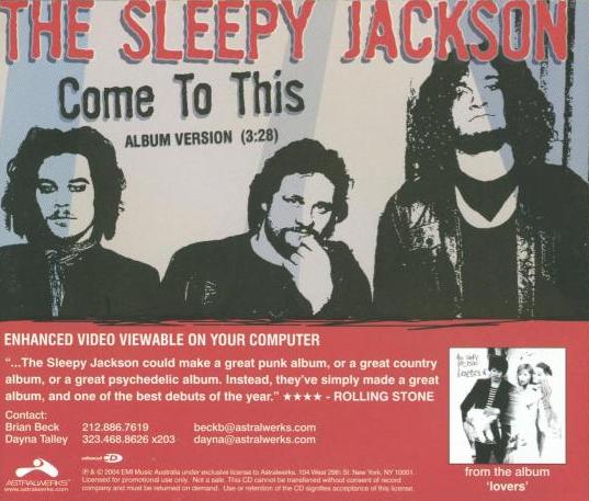 The Sleepy Jackson: Come To This PROMO Music CD Album & Enhanced Video Lovers