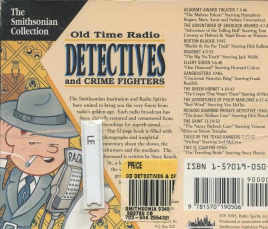 Old Time Radio "Detectives and Crime Fighters" from The Smithsonian Collection (1995). This set includes 4 CDs (approximately 5 hours) and a 52‑page booklet with a foreword by Stacy Keach, Sr. It contains 12 complete radio shows.