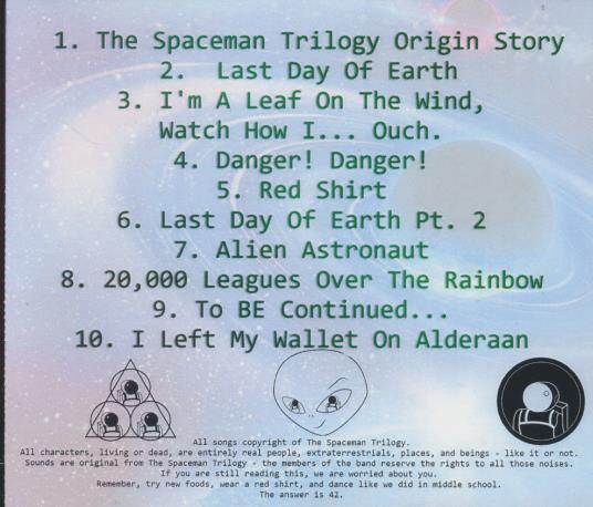 All songs copyright of The Spaceman Trilogy. All characters, living or dead, are entirely real people, extraterrestrials, places, and beings - like it or not. Sounds are original from The Spaceman Trilogy - the members of the band reserve the rights to all those noises. If you are still reading this, we are worried about you. Remember, try new foods, wear a red shirt, and dance like we did in middle school. The answer is 42.