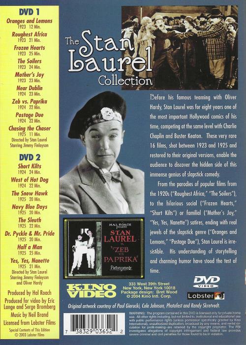 Before his famous teaming with Oliver Hardy, Stan Laurel was for eight years one of the most important Hollywood comics of his time, competing at the same level with Charlie Chaplin and Buster Keaton. These very rare 16 films, shot between 1923 and 1925 and restored to their original versions, enable the audience to discover the hidden side of this immense genius of slapstick comedy. Rom the parodies of popular films from the 1920 ("Roughest Africa," "The Soilers") to the hilarious social ("Frozen Hearts," "Short Kilts") or familial ("Mother's Joy," "yes, Yes, Nanette") satires, ending with real jewels of the slapstick genre ("Oranges and Lemons," "Postage Due"), Stan Laurel is irresistible. His understanding of storytelling and charming humor have stood the test of time.