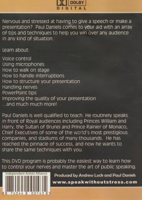 Nervous and stressed at having to give a speech or make a presentation? Paul Daniels comes to your aid with an array of tips and techniques to help you win over any audience in any kind of situation. Learn about: Voice control Using microphones How to walk on stage How to handle interruptions How to structure your presentation Handling nerves PowerPoint tips Improving the quality of your presentation ...and much much more! Paul Daniels is well qualified to teach. He routinely speaks in front of Royal audiences including Princes William and Harry, the Sultan of Brunei and Prince Rainier of Monaco, Chief Executives of some of the wold's most prestigious companies, and stadiums of many thousands. He has reached the pinnacle of success, and now he wants to share the same techniques with you. This DVD program is probably the easiest way to learn how to control your nerves and master the art of public speaking.