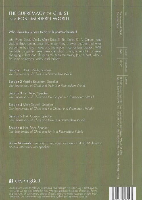 Session 1 David Wells, Speaker The Supremacy of Christ in a Postmodern World Session 2 Voddie Baucham, Speaker The Supremacy of Christ and Truth in a Postmodern World Session 3 Tim Keller, Speaker The Supremacy of Christ and the Gospel in a Postmodern World Session 4 Mark Driscoll, Speaker The Supremacy of Christ and the Church in a Postmodern World Session 5 D.A. Carson, Speaker The Supremacy of Christ and Love in a Postmodern World Session 6 John Piper, Speaker The Supremacy of Christ and Joy in a Postmodern World Bonus Materials: Insert disc 3 into your computer's DVD-ROM drive to access interviews with speakers.