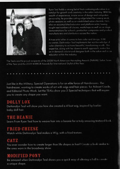 Ryan Teal holds a strong belief that continuing edur.otion is II catalyst for growth and creativity in the salon industry. Willi his wealth of experience, innate sense of design and ouispoltun personality, he provides cutting-edge talent for runway work, photo sessions as well as an established salon clientoln I In's also an accomplished educator and platform artist, having taught vast numbers of classes, workshops as wall us on slow, demonstrations for schools, production companies and t manufacturers and distributors across the nation. A true artist when it comes to hair color and duiiip, II Al co•owner, DeAnnalyn Teal implements her vast knowlmlipt, color chemistry to achieve beautiful, transforming rosillIs expertise, along with her down to earth approach, inirlo•, an in demand colorist and designer both in the salon mid ns nu educator within the industry. The Teals are the proud recipients of the 2008 North American Hairstyling Awards (NAHA)- Salon Imnn of the Year and the 2009 MIRROR Awards for International Stylist of the Year * * * * * * * * * * * * * * * * * * * * * * * * * * * * * * * * * Just like in the Military, Special Operations is for an elite force of Hairchessinii I he hairdresser, wanting to create works of art with wigs and hair pieces for Advont Gold°, and Editorial Photo Work. Let the TEALs show you 5 Special techniques that will 'mom, you to create any shape you want. DOLLY LOX DeAnnalyn Teal will show you how she created a 4 foot wig, inspiturl by ',whip baby doll hair. THE BEANIE Learn From Ryan Teal how to weave hair into a beanie for a truly amazing textuitid look FRIED CHEESE Watch while DeAnnalyn Teal makes a Wig, with a fried texture. You ever wonder how to create larger than life shapes in hail? Color, a look sinrilat b, the ones worn in the broadway show. MODIFIED PONY Be amazed when DeAnnalyn Teal shows you a quick way of oltutiii9 st I oil In I WI Ili. a unique shape. THE TEALS PRESENT SPECIAL OPS
