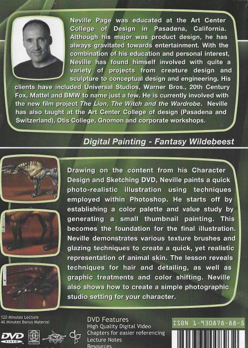Digital Painting - Fantasy Wildebeest Drawing on the content from his Character Design and Sketching DVD, Neville paints a quick photo-realistic illustration using techniques employed within Photoshop. He starts off by establishing a color palette and value study by generating a small thumbnail painting. This becomes the foundation for the final illustration. Neville demonstrates various texture brushes and glazing techniques to create a quick, yet realistic representation of animal skin. The lesson reveals techniques for hair and detailing, as well as graphic treatments and color shifting. Neville also shows how to create a simple photographic studio setting for your character.