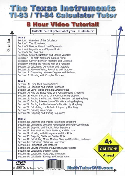 Unlock the power of the TI-84 / TI-83 Graphing Calculator!This 8 Hour 3-DVD course teaches you how to use the major functions of the calculator by working example problems. Gain an advantage in your class and on standardized tests such as the SAT, ACT, GRE, and more!