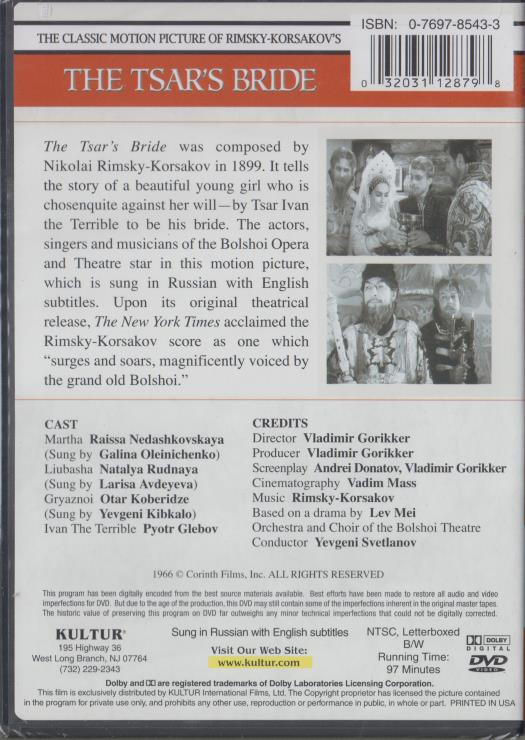 The Tsar's Bride tells the story of a beautiful young girl chosen by Tsar Ivan to be his bride. This film stars the actors, singers, and musicians of the Bolshoi Opera and Theatre. The motion picture is sung in Russian with English subtitles and features the acclaimed Rimsky-Korsakov score.