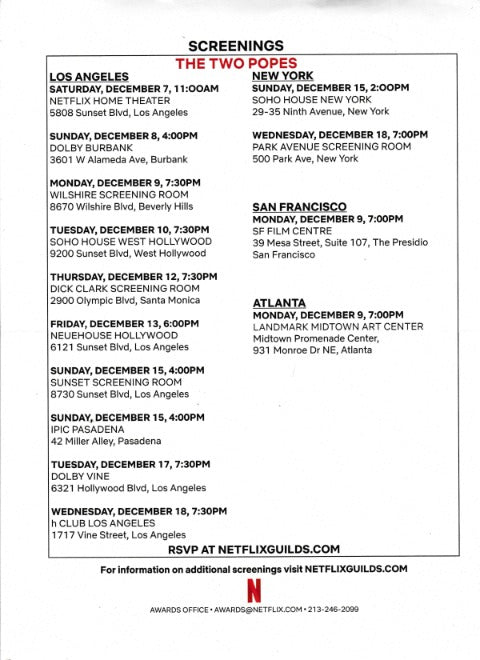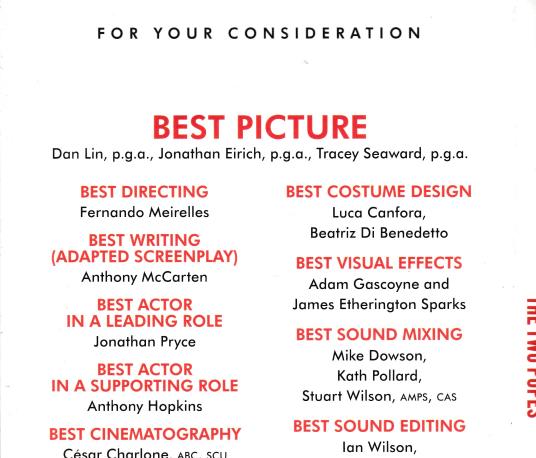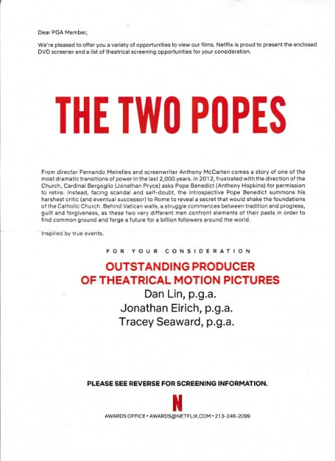THE TWO POPES W/ LETTER FYC (FOR YOUR CONSIDERATION)