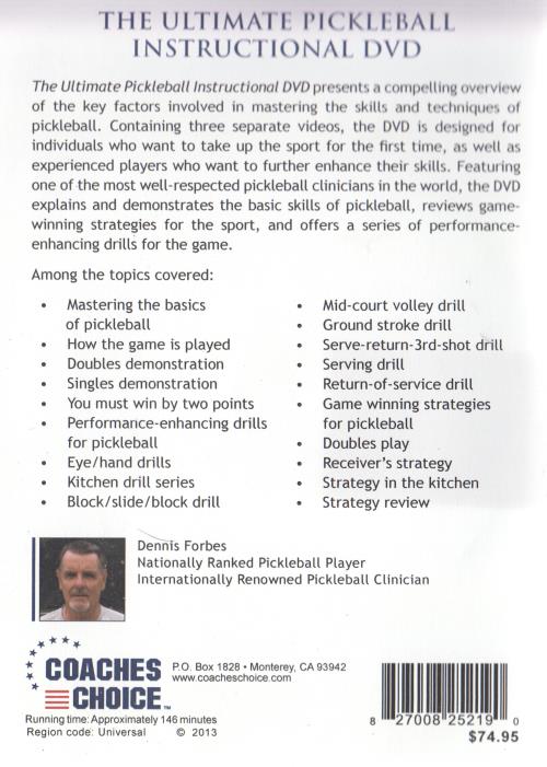 Offers an engaging summary of the essential elements required to master pickleball techniques and skills. This DVD includes three distinct videos aimed at newcomers eager to learn the sport, as well as seasoned players looking to sharpen their abilities. Featuring one of the most highly regarded pickleball instructors worldwide, the DVD clearly explains and demonstrates fundamental pickleball skills, reviews effective strategies to win matches, and presents a variety of drills designed to boost performance.