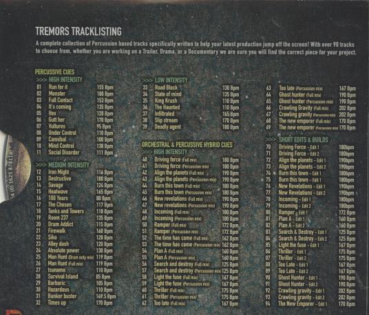 DISC 4: A complete collection of Percussion based tracks specifically written to help your latest production jump off the screen! With over 90 tracks to choose from, whether you are working on a Trailer, Drama, or a Documentary we are sure you will find the correct piece for your project.
