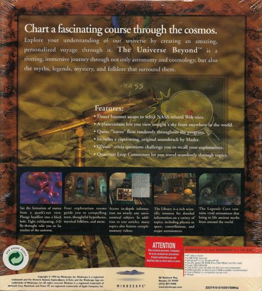 Touted as "the amazing way to explore your universe", this "game" allows you to chart a fascinating course through the cosmos. Explore your understanding of our universe by creating a personalized voyage through it. The Universe Beyond is a riveting, immense journey through not only astronomy and cosmology, but also the myths, legends, mystery and folklore that surround them.