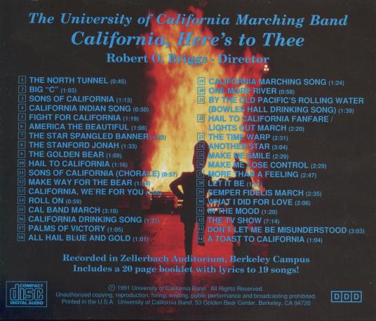 THIS RECORDING BY THE UNIVERSITY OF CALIFORNIA MARCHING BAND WAS RELEASED IN 1991 AND IS SUBTITLED "THE CAL BAND CENTENNIAL RECORDING: 1891-1991 - CELEBRATING 100 YEARS OF MUSICAL EXCELLENCE."