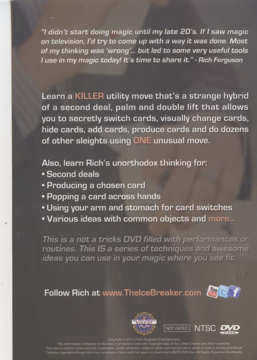 Learn a utility move that's a strange hybrid of a second deal, palm, and double lift that allows you to secretly switch cards, visually change cards, hide cards, add cards, produce cards, and do dozens of other sleights using unusual moves. Also, learn Rich's unorthodox thinking for: