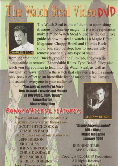 This video is one of the most astonishing illusions in close-up magic. It is a true reputation maker! It's the definitive guide on how to take a watch as a Magic Effect. Magicians show you, step by step, how to successfully remove practically any type of watch; from the traditional Buckle type, to the Flip-Tab, and even the "impossible to remove" Expandable Rolex-Type Band! They also s teach you fun routines to lead into the Steal, as well as imaginative ways to return the watch that elevates it from a simple pick the pocket effect to an incredible feat of magic that will amaze and astonish everyone in your audience!
