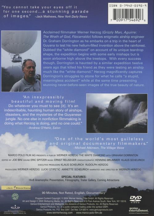Acclaimed filmmaker Werner Herzog (Grizzly Man ,Aguirre: The Wrath of God, Fitzcarraldo) follows enigmatic airship engineer Dr. Graham Dorrington as he embarks on a trip in the heart of Guyana to test his new helium-filled invention above the rainforest. Dubbed the "white diamond" on account of its unique teardrop shape, the expedition begins with some early mishaps but is soon airborne high above the treetops. With every success though, Dorrington is haunted by a similar expedition twelve years ago that killed his friend as they were testing an airship much like the "white diamond." Herzog magnificently captures Dorrington's struggles to atone for what he calls "a stupid, meaningless accident" while at the same time presenting stunning never-before-seen images of the true beauty of nature.