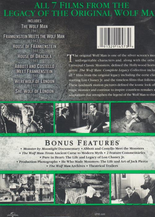 The original Wolf Man is one of the silver screen's most unforgettable characters and, along with the other Universal Classic Monsters, defined the Hollywood horror genre. The Wolf Man: Complete Legacy Collection includes all 7 films from the original legacy including the eerie classic starring Lon Chaney Jr. and the timeless films that followed.